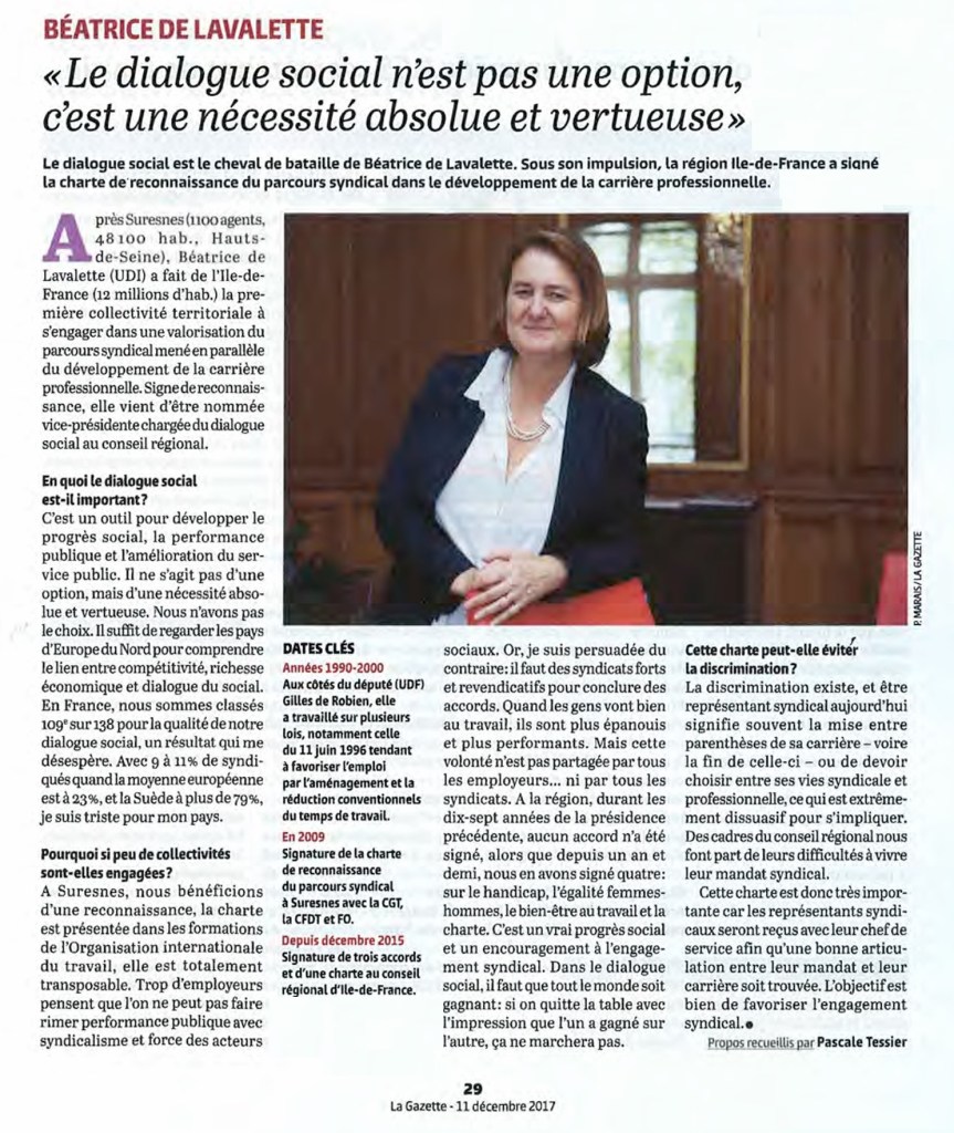 Le socle de la démarche d’exception initiée par Béatrice de Lavalette est la charte de reconnaissance du parcours syndical, inspirée d’AXA France, absolument pionnier et quasi-unique aujourd’hui dans la fonction publique, que l’élue a signée en 2009 avec les syndicats territoriaux (CGT, CFDT, FO), afin de favoriser l’engagement syndical et le renouvellement des équipes par la valorisation et la reconnaissance du parcours syndical.